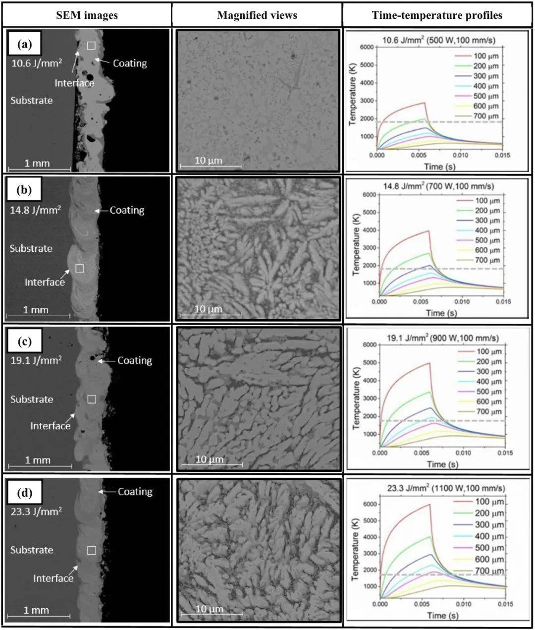 圖18 利用有限元傳熱模型獲得了不同激光加工條件下cr - motawzr基LC-RHEACs的SEM顯微圖及時(shí)間-溫度循環(huán),研究了其熱動(dòng)力學(xué)行為。時(shí)間-溫度曲線顯示,高激光注量導(dǎo)致溫度值高于襯底熔點(diǎn)(曲線中的虛線),從而在HEA包層和襯底之間產(chǎn)生更好的混合和良好的界面結(jié)合。