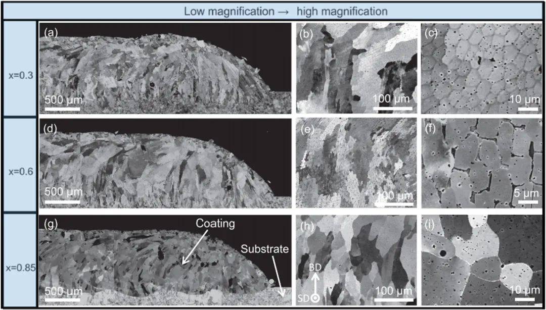 圖 21 SEM圖像顯示CoCrNiFeAl單層激光層的暗和亮外觀表面形態(tài)的不同放大倍率水平 x(0.3 ≤ x ≤ 0.85)。通過(guò)添加鋁,微觀結(jié)構(gòu)從等軸轉(zhuǎn)變?yōu)闃?shù)枝狀;(a-c)鋁0.3涂層;(d-f)鋁0.6涂層;(g-i)鋁0.85涂層