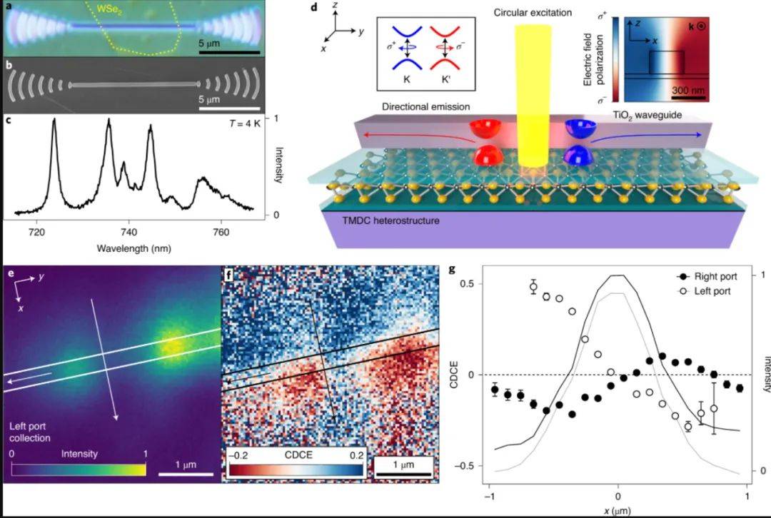 為了創(chuàng)造光子電路的新元件,High和他的團隊將二維材料二硒化鎢與光子波導連接在一起。材料帶結構的獨特性質(zhì)使其能夠根據(jù)光偏振的螺旋度以不同的方式與光相互作用。在納米光子結構中,光被限制在其波長以下,圓偏振自然產(chǎn)生,螺旋度被鎖定在光的傳播方向上。
