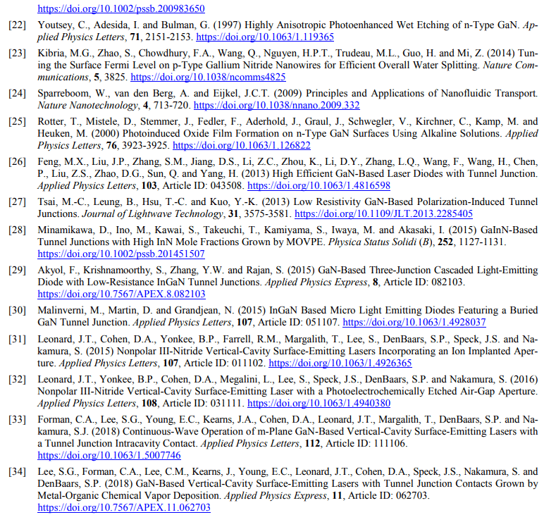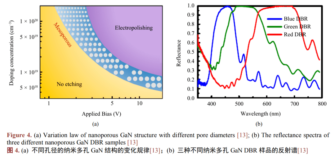 國內(nèi)外研究學(xué)者利用電化學(xué)刻蝕技術(shù),把較高摻雜濃度的 n 型氮化鎵(n+-GaN)樣品作為陽極,浸泡在酸性[10]-[16]或堿性[17] [18]電解質(zhì)中,在一定電壓的作用下,n+-GaN 會發(fā)生電化學(xué)刻蝕反應(yīng)形成納米多孔氮化鎵(nanoporous GaN,簡寫 NP-GaN)結(jié)構(gòu)。2015 年耶魯大學(xué) Jung Han 研究組[13]報道了不同摻雜濃度的 n 型 GaN (n-GaN/n+-GaN) DBR 樣品中的 n+-GaN 在電化學(xué)刻蝕工藝過程中形成不同孔徑尺寸的納米多孔 GaN 結(jié)構(gòu)的變化規(guī)律,如圖 4(a)所示。由于該 GaN/NP-GaN 結(jié)構(gòu) DBR 具有折射率差值較大(Δn ≥0.5)的優(yōu)勢,因此使用較少對數(shù)的 DBR 就能夠獲得高反射率(R > 99%),并且高反射帶寬在紅光–藍(lán)綠光范圍內(nèi)可調(diào),如圖 4(b)所示。2015 年韓國全南大學(xué)[14]首次實現(xiàn)了 GaN/NP-GaN DBR 結(jié)構(gòu) VCSEL 光注入激射發(fā)光。2017 年耶魯大學(xué) Jung Han 研究組[19]報道了 GaN/NP-GaN DBR 結(jié)構(gòu)藍(lán)紫光 LED,2018 年該組又報道了一種具有納米多孔氮化鎵(NP-GaN)的 InGaN/GaN 微盤激光器[20]。這些研究結(jié)果表明了GaN/NP-GaN 構(gòu)成的 DBR 具有高反射率和良好的可控性,這都為制作高質(zhì)量氮化物 VCSEL 諧振腔奠定了堅實基礎(chǔ)。不同的電化學(xué)刻蝕反應(yīng)條件下形成不同孔徑的納米空氣孔 GaN 結(jié)構(gòu)[21] [22] [23] [24] [25]。這些研究結(jié)果充分表明了 GaN/NP-GaN 構(gòu)成的 DBR 具有高反射率和良好的可控性,能夠用來制作高質(zhì)量氮化物 VCSEL 諧振腔。這種具有較低折射率的納米空氣孔 GaN 材料仍然具備導(dǎo)電的特性,表明了這種 GaN/NP-GaN DBR 結(jié)構(gòu)完全可以應(yīng)用在電泵浦 GaN 基 VCSEL 中。