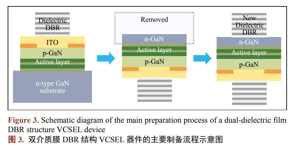 國內(nèi)外的研究結(jié)果表明,若要獲得外延生長高質(zhì)量氮化物異質(zhì)結(jié) DBR,實現(xiàn) GaN 基 VCSEL 室溫下電注入激射,需要解決以下兩個主要難題:首先需要解決高質(zhì)量氮化物諧振腔的制作難題。高質(zhì)量氮化物諧振腔難以制作的主要原因是:當(dāng)采用外延生長氮化物異質(zhì)結(jié) DBR 時,高 A1 組分的 A1 (Ga) N 與 GaN之間存在較大的晶格失配和熱失配,異質(zhì)結(jié)外延生長過程中由于應(yīng)力積累、熱失配而產(chǎn)生晶格缺陷和開裂現(xiàn)象,這些都加大了外延生長高質(zhì)量氮化物異質(zhì)結(jié) DBR 的難度,并導(dǎo)致 DBR 反射率降低[1] [2] [3]。GaN 和 AlN 的晶格失配為 2.4%,折射率差約為 0.4,外延生長過程中會產(chǎn)生位錯和開裂現(xiàn)象,即使外延生長 Al0.5Ga0.5N/GaN (折射率差約為 0.2)異質(zhì)結(jié)構(gòu),也難以獲得高質(zhì)量的氮化物異質(zhì)結(jié) DBR。而采用與GaN 晶格匹配的 AlInN 材料時,其中的 In 組分又極難控制,很難獲得高質(zhì)量的 AlInN/GaN 氮化物異質(zhì)結(jié) DBR,并且其較小的折射率差也使得其高反射帶寬相對較窄[4]。盡管雙介質(zhì)膜 DBR 容易獲得較高的反射率,但是 VCSEL 器件的制備過程相對復(fù)雜[5] [6] [7] [8] [9],主要制備流程如圖 3 所示,首先在襯底上制作底部介質(zhì) DBR;其次通過薄膜轉(zhuǎn)移的方式去除原始襯底;最后制作頂部介質(zhì) DBR,從而實現(xiàn)由底部和頂部介質(zhì)膜 DBR 構(gòu)成的雙介質(zhì)膜 VCSEL。其次需要解決 p 型 DBR 導(dǎo)電性差的難題。p 型 DBR 導(dǎo)電性差的主要原因是 AlGaN/GaN DBR 為高阻特性,同時外延生長高 Al 組分 AlGaN 十分困難。由于目前所采用的 p 型氮化物異質(zhì)結(jié) DBR 材料導(dǎo)電性較差,因而電注入 VCSEL 需要采用內(nèi)腔接觸 ITO 膜電極結(jié)構(gòu)。盡管減小 ITO 膜電極厚度有利于降低光吸收,但是 ITO 膜過薄(小于 50 nm)又會明顯加大 ITO 膜的工藝制作難度,明顯增大器件的閾值電流密度。