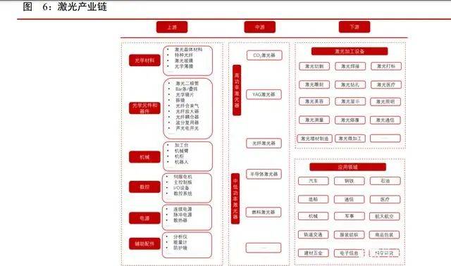 激光產(chǎn)業(yè)鏈中,上游主要以光學(xué)材料、光學(xué)元件和器材為主,也包括設(shè)備相關(guān)的機(jī) 械、數(shù)控、電源和其他輔助配件;中游是以激光器為主的核心部件;下游為激光切割、 激光焊接、激光打標(biāo)等激光設(shè)備,這些設(shè)備的應(yīng)用領(lǐng)域主要以工業(yè)加工制造為主。下游 應(yīng)用領(lǐng)域廣泛,包括汽車、通信、醫(yī)療、軍事、3C、機(jī)械、科學(xué)研究等。激光設(shè)備成本 中,人工及制造成本占總成本的約 10%,原材料占總成本的約 90%。其中,中游核心部 件激光器成本占比約 30%-50%。目前,我國激光行業(yè)形成以北京、江蘇、湖北、上海和 廣東等經(jīng)濟(jì)發(fā)達(dá)省市為主體的華中地區(qū)、環(huán)渤海、長江三角洲和珠江三角洲四大激光產(chǎn) 業(yè)群。