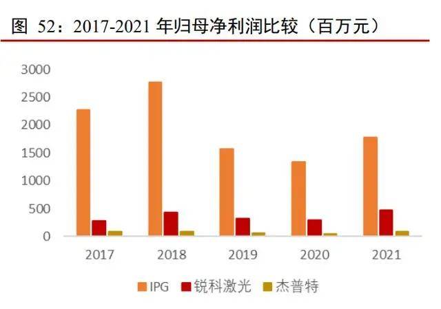 IPG2017-2021 年歸母凈利潤呈下降趨勢,2021 年為 17.75 億元,同比增長 32.49%。銳科激光與杰普特呈相反趨勢,2021 年歸母凈利潤分別為 4.74 億元、0.91 億元,分別 同比增長 60.17%、106.03%。