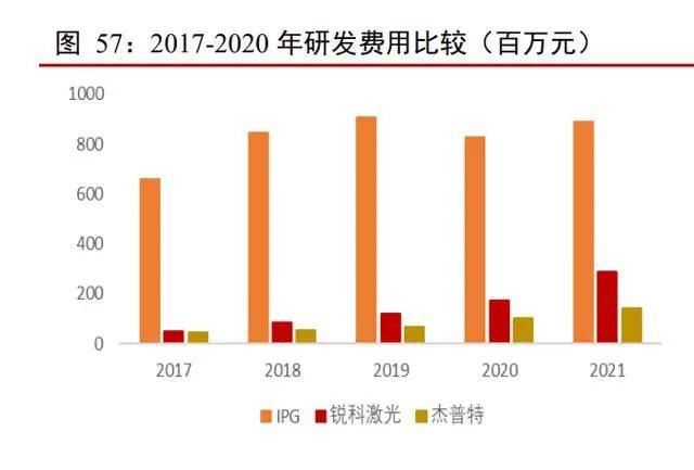 近三年,IPG 研發(fā)費(fèi)用率維持在 10%波動(dòng);杰普特研發(fā)費(fèi)用率維持 11%以上;銳科 激光研發(fā)費(fèi)用率逐漸提升。2021 年,IPG、銳科激光、杰普特研發(fā)費(fèi)用分別為 8.89 億元、 2.86 億元、1.43 億元,分別同比增長 7.47%、65.37%、42.95%。