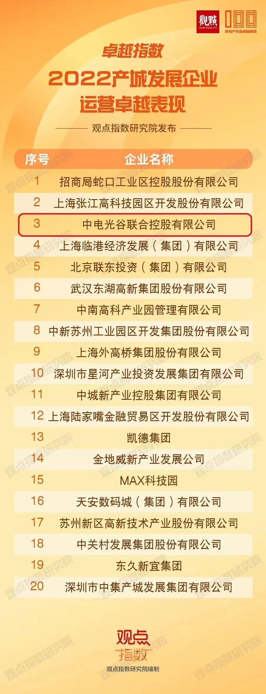 4月12日,在2022觀點年度論壇上,觀點指數(shù)研究院發(fā)布“卓越指數(shù) · 2022產(chǎn)城發(fā)展企業(yè)運營卓越表現(xiàn)”研究成果并公布榜單,中電光谷位列榜單第三名?!?中電光谷位列榜單...