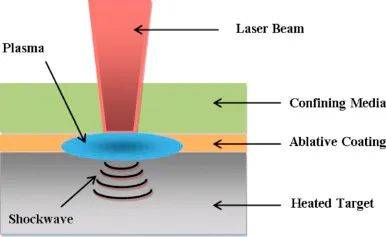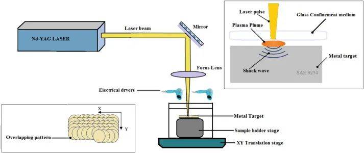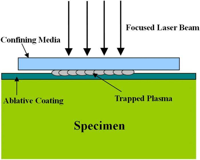 上圖為WLSP實(shí)驗設(shè)置示意圖。在WLSP過程中,將目標(biāo)材料加熱到一定的加工溫度??梢圆捎枚喾N加熱方法來提供熱能。在目標(biāo)樣品的上表面放置一層燒蝕涂層材料,以吸收激光能量,并保護(hù)樣品表面不受任何不必要的損傷。當(dāng)聚焦脈沖激光能量到達(dá)樣品表面時,燒蝕涂層被汽化和電離,形成激光誘導(dǎo)的等離子體。激光誘導(dǎo)等離子體的水動力膨脹受到置于燒蝕涂層之上的透明約束介質(zhì)的限制。從而產(chǎn)生激光誘導(dǎo)的沖擊波并傳播到目標(biāo)材料中,產(chǎn)生有益的塑性變形。