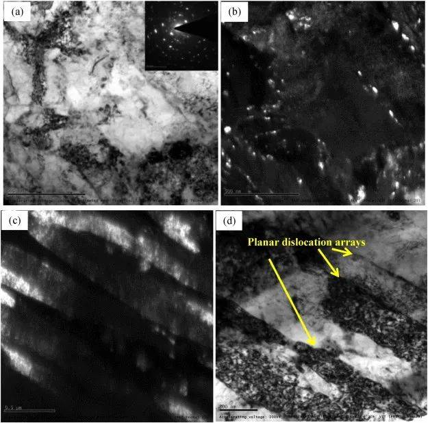 圖6 熱激光沖擊強(qiáng)化+1h后淬火的TEM圖像(a)亮場圖像(圖中(a)分別顯示SAED模式)(b)分別顯示暗場圖像(c)層狀位錯帶(LDB)暗場圖像(d)亮場圖像顯示平面位錯。