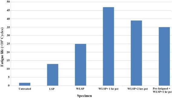 沖擊后回火結(jié)果表明,一小時的沖擊后回火試樣在41–47×105個循環(huán)之間斷裂。然而,沖擊后兩小時回火試樣在35–39×105個循環(huán)之間斷裂,這是由于RS的松弛。從RS結(jié)果可以理解過度回火,并且也發(fā)生了嚴(yán)重的硬度降低。由于2小時的沖擊后回火,RS的松弛超過了1小時的沖擊后回火樣品,這說明了RS對試樣疲勞壽命的影響。對部分預(yù)疲勞試件(未噴丸試件50%壽命周期為0.85 × 105循環(huán))的修復(fù)效果進(jìn)行了評價。對WLSP + 1 h后回火再生試件進(jìn)行疲勞試驗,結(jié)果表明(圖9),該技術(shù)也能有效修復(fù)試件。