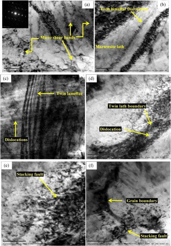 SEM圖像顯示未噴丸試件的微觀結(jié)構(gòu)如圖4a所示,LSP試件表面發(fā)生嚴(yán)重塑性變形如圖4b所示。FE-SEM顯示了WLSP過程產(chǎn)生的納米析出和細(xì)化晶粒,如圖4c所示。最初,在LSP表面很少發(fā)現(xiàn)再凝固的趨勢。觀察到單點(diǎn)熔化部分(圖4c中箭頭標(biāo)記),這可能是由于允許直接激光燒蝕的非均勻較弱脫碳表面造成的。后來,為了糾正這些問題,精確地考慮脫碳表層厚度和激光脈沖密度發(fā)射的重疊,以避免沖擊波阻抗失配,從而產(chǎn)生強(qiáng)大的RS。超高應(yīng)變誘導(dǎo)晶粒細(xì)化機(jī)制是金屬材料塑性變形的重要組成部分。孿晶是高層錯能鋼變形機(jī)制的主要特征。鋼的層錯能在20到40 mJ/m2。Lu等人研究了多重LSP誘導(dǎo)的不銹鋼組織特征的晶粒細(xì)化機(jī)理。從圖5和圖6的表面層透射電鏡圖像可以看出,WLSP產(chǎn)生了一些典型的嚴(yán)重塑性變形的微觀結(jié)構(gòu)特征,如堆疊斷層、微剪切帶、機(jī)械孿晶、平面位錯陣列和孿片層位錯。微觀組織特征是低能WLSP引起的晶粒細(xì)化引起的嚴(yán)重塑性變形的證據(jù)。