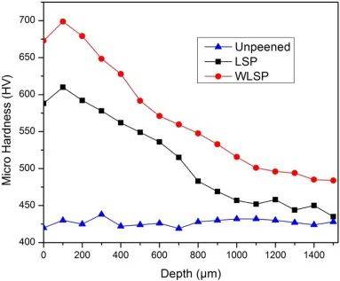 激光燒蝕后,金屬表面的平均粗糙度由0.4321 ~ 0.4396μm提高到1.1987 ~ 1.2470μm。由于激光脈沖和溫樣的復(fù)合熱效應(yīng),LSP試樣的平均表面粗糙度(1.1262-1.5127 μm)略小于環(huán)境條件下的激光LSP。與噴丸處理相比,激光LSP產(chǎn)生的粗糙度非常小。同樣,平均表面粗糙度也被控制。