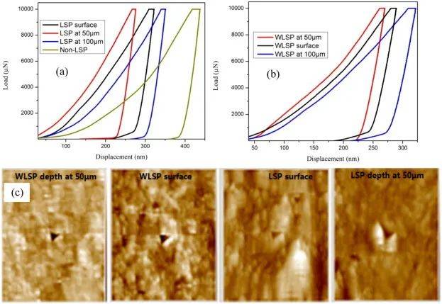 已經(jīng)對LSP表面改性的效果進(jìn)行了大量研究,其中大多數(shù)針對疲勞循環(huán)增強(qiáng)。LSP和WLSP(圖8a和b)的深度方向納米機(jī)械變形行為通過使用的納米壓痕試驗進(jìn)行解釋。在實(shí)驗的少數(shù)情況下,硬度的提高是由于誘導(dǎo)RS而不是塑性變形,塑性變形可能是由于材料塑性變形的誘導(dǎo)峰值壓力較小而發(fā)生的。而在當(dāng)前工藝中,這兩種情況都發(fā)生在金屬試樣的表面上。兩種工藝的燒蝕表面都表現(xiàn)出較大的表面粗糙度,這對納米壓痕的影響更明顯,表面納米硬度值的降低比亞表面硬度值的降低更為明顯。如掃描探針顯微鏡(SPM)圖像所示,燒蝕表面上沒有堆積或任何此類裂紋(圖8c)。從壓痕圖像上看,表面損傷是完全禁止的。納米壓痕表面粗糙度效應(yīng)最小,燒蝕后的表面機(jī)械性能與亞表面基本一致由于彈性模量和硬度差,異物損傷(FOD)會導(dǎo)致汽車和飛機(jī)行業(yè)的疲勞失效。研究表明,這兩種方法均有效提高了試樣的硬度和彈性模量,使試樣的深度有了一定程度的改變。WLSP試樣在地下的塑性變形能量為2.76 × 10?9 N m,優(yōu)于LSP試樣。