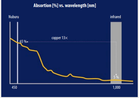 銅吸收的藍色能量比紅外多13倍,比藍色比綠色多20%。