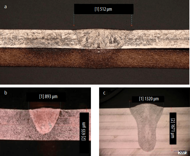 藍色激光的速度和質(zhì)量優(yōu)勢也適用于將Tab連接到不銹鋼外殼上,用于圓柱形電池。最新發(fā)布的產(chǎn)品甚至可以連接毫米級厚度的銅(如母線)和毫米級厚度的不銹鋼(如電池外殼)??赡苄苑秶鐖D2a-c所示。替代方法,包括電阻、紅外激光、金屬惰性氣體(MIG)、鎢惰性氣體(TIG)和超聲波焊接,無法與藍色激光的速度和質(zhì)量相匹配。同一臺藍色激光器只需調(diào)整工藝參數(shù)即可完成所有這些連接操作,從而使生產(chǎn)線既簡單又可靠。
