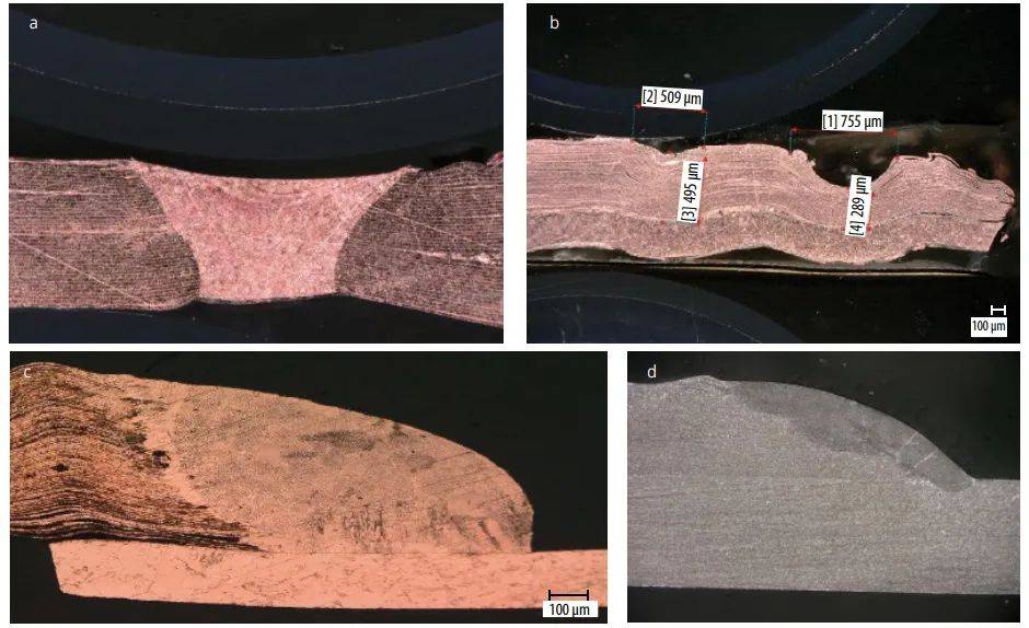 各種連接操作可能是必要的。例如,棱柱形或袋形電池可能需要將40或80個8μm厚的銅箔連接在一起。速度是關(guān)鍵,因為自動化工廠每天可能生產(chǎn)數(shù)十萬塊電池,但缺陷會降低產(chǎn)量,因此質(zhì)量不能受到影響。如圖1a所示,藍色激光連接了42個沒有缺陷的箔材,這是超聲波連接的顯著改進,如圖1b所示。然后將箔片連接到一個更厚的Tab上,厚度為100或200微米。超聲波焊接需要一個與新尺寸相匹配的單獨焊接頭。藍色激光器沒有這樣的限制,甚至不需要兩個制造步驟,如圖1c和1d所示,激光在一個操作中連接箔和標簽。當(dāng)焊接鋁時,藍色激光產(chǎn)生同樣的質(zhì)量。