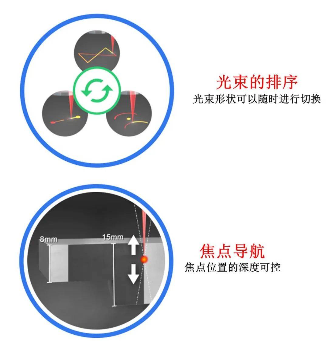 光束的空間排列則在另外一個(gè)層面增強(qiáng)其柔性,使得你有能力在快如毫秒的時(shí)間內(nèi)在不同的光束形狀之間進(jìn)行切換。這就意味著你可以創(chuàng)造一系列不同的光束形狀并將其編寫在程序里面按照一定的次序及性能要求來(lái)運(yùn)行,以不同的速度來(lái)運(yùn)行,以你所選擇的任何間隔來(lái)進(jìn)行。你所選擇的光束排序,理所當(dāng)然的,取決于你所要達(dá)成的目標(biāo),但這最終要滿足你所需要的柔性加工的需求。