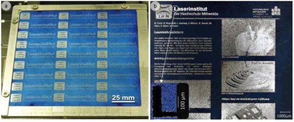 圖4選擇性去除6“硅片(hatch=30μm,Pcw=400 W,v=200 ms-1,w86=40μm)的氮化硅層(Si3N4)。整個(gè)硅片的處理時(shí)間=20 s(a);分辨率測(cè)試。激光打印DIN A4頁(yè)面,高度為10 mm(b)