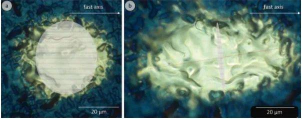 對(duì)于掃描速度為100m s–1、脈沖持續(xù)時(shí)間為數(shù)十納秒的情況,可以忽略額外伸長(zhǎng)(圖3a;每側(cè)減小約3μm)或標(biāo)稱交互作用區(qū)的減小。在這種情況下,產(chǎn)生的材料行為沒有偏離靜態(tài)激光束的單個(gè)脈沖行為。與此相反,在圖3b(額外延伸30μm)中可以清楚地觀察到,由于高偏轉(zhuǎn)速度的影響,標(biāo)稱“脈沖”持續(xù)時(shí)間相互作用區(qū)(陰影區(qū)域)急劇減少。因此,在標(biāo)稱持續(xù)時(shí)間之外的區(qū)域,表演流暢性急劇下降。在這種情況下,必須預(yù)期材料性能的偏差。