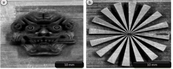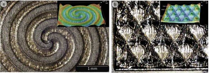 應(yīng)用多邊形掃描儀的深度映射模式,還可以選擇高功率連續(xù)激光作為2.5D高速雕刻的光源。通常情況下,連續(xù)波輻射會(huì)產(chǎn)生較大的熔池,但快速的掃描速度和由此產(chǎn)生的短交互時(shí)間允許在沒有熔融微觀結(jié)構(gòu)的情況下雕刻金屬(圖5a)。