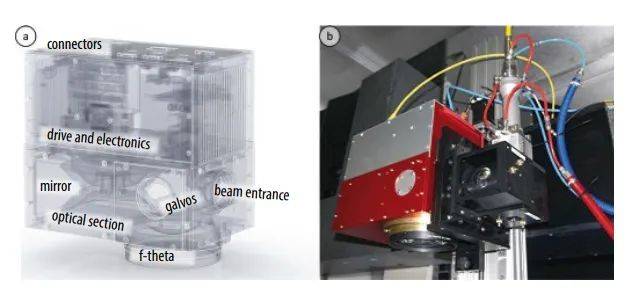 圖1高速二維多邊形掃描儀:掃描儀的原理設(shè)置(a)。多邊形掃描儀安裝在加工裝置內(nèi),并連接到3kWIPG光纖激光器(b)。