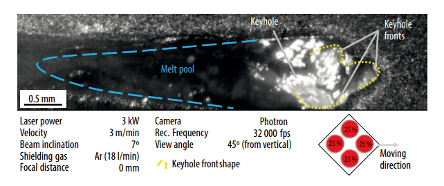 實(shí)驗(yàn)中使用了不同材料配置和設(shè)置的間隙橋接和光束成形,而使用quattroXX改變了能量分布。實(shí)現(xiàn)高速成像以捕獲處理區(qū)的圖像。以32000 fps的幀速率記錄的高速圖像顯示了由四點(diǎn)配置引起的單獨(dú)鎖孔形成的詳細(xì)視圖(圖2)。鎖孔前端可明顯熔化加工區(qū)前方的基材,前方有一個(gè)狹窄的熔池立即進(jìn)入鎖孔。從尾隨點(diǎn)開始的第四個(gè)鎖孔位于熔池內(nèi)。熔體池被認(rèn)為是穩(wěn)定的,顯示出較低的熔體波動(dòng)。