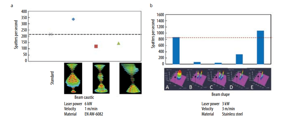 對(duì)于軸向形狀的光束(圖4a),可以看出,與單點(diǎn)布置相比,在較低的小孔區(qū)域,隨著激光束強(qiáng)度的增加,聚焦深度更均勻,支持穩(wěn)定的過程并減少飛濺。