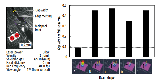 不對(duì)稱條件會(huì)導(dǎo)致過程中更高的動(dòng)力學(xué),減少熔體向另一張板材的移動(dòng)。然而,熔體從一個(gè)薄板流向另一個(gè)薄板是由間隙中心的高能點(diǎn)支撐的。結(jié)果表明,橫向和軸向光束整形可以提高激光焊接過程的穩(wěn)定性。