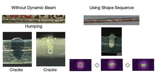 在焊接操作時,動態(tài)光束形狀控制著材料的熔池和熱等離子體匙孔(小孔)。當(dāng)光束移動到焊縫的下線時,材料從固態(tài)到液態(tài)到氣態(tài),然后再反向進行凝固。通過精確的控制熔池和減少附屬物的飛濺,再凝固,在材料的理想狀態(tài)凝固,從而形成高質(zhì)量的焊縫。