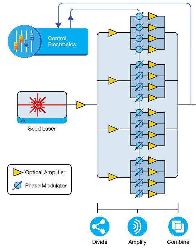 圖3 在動態(tài)光學(xué)激光調(diào)整的運行過程中,從單一種子光纖中處理啊的激光束進行分割并通過一個平行排列的電-光調(diào)節(jié)器,每一個進行驅(qū)動一個光學(xué)放大器。