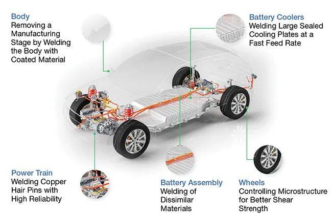 圖1 電動汽車的發(fā)展對制造商和焊接提出了新的挑戰(zhàn)。除了引入全新的部件和系統(tǒng)之外,電動化還進一步的引入了銅合金和鋁合金等材料的大量應(yīng)用。激光焊接技術(shù)及其裝備使得電動化所需要的成本-效率方面的要求能夠保持同步,但這些工具將得益于光束的巨大的柔性和控制。