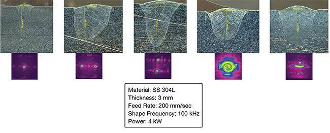 圖4 動態(tài)光束調(diào)整時使用一種快速的優(yōu)化不同的焊接工藝的技術(shù),使用的是測試多個設(shè)置步驟來確定的光束形態(tài)對焊縫的影響。