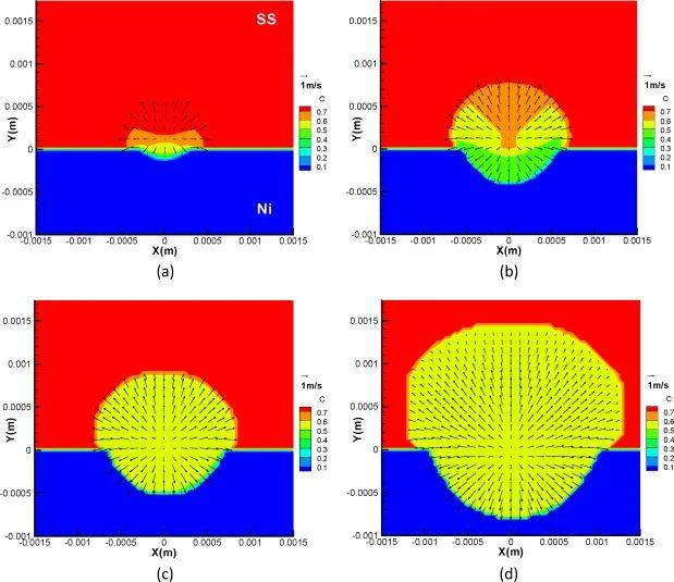 (2)由于有足夠的混合時(shí)間,90ms后鐵元素在熔池中的分布是均勻的。由于強(qiáng)對(duì)流,物質(zhì)在上表面的傳輸比橫截面更快。在熔池形成的初始階段,質(zhì)量傳輸速度最高,在不銹鋼和鎳的激光點(diǎn)焊過(guò)程中,質(zhì)量傳輸速度隨時(shí)間而降低。