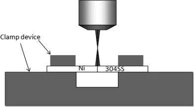 實(shí)驗(yàn)中使用了304不銹鋼和鎳。焊接前用丙酮清潔表面。在一臺(tái)具有五軸數(shù)控工作站的1kW Nd:YAG激光材料加工系統(tǒng)上進(jìn)行了實(shí)驗(yàn)。150毫米焦距透鏡用于聚焦激光束。離焦距離為9.5mm,試樣頂面對(duì)應(yīng)的光束半徑為1.0mm。使用650 W的激光功率,相互作用時(shí)間為500 ms。圖1顯示了尺寸為20 mm×10 mm×2 mm的304不銹鋼和鎳板的激光點(diǎn)焊示意圖。