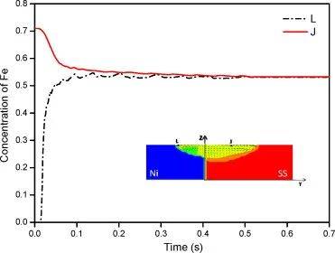圖8顯示了遠(yuǎn)離熱源0.5 mm的兩個(gè)位置的鐵濃度變化。如圖所示,熔池形成后,元素快速混合。因此,在熔化的初始階段,不銹鋼側(cè)的鐵濃度降低,而鎳側(cè)的鐵濃度升高,且速度很快。隨著兩個(gè)位置的濃度差減小,質(zhì)量傳輸變得更加緩慢。因此,在不銹鋼和鎳的激光點(diǎn)焊過(guò)程中,兩個(gè)位置的濃度差和質(zhì)量傳輸速度都會(huì)隨著時(shí)間的推移而減小,直到元素分布變得均勻?yàn)橹埂?/p>