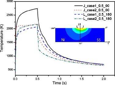 兩種情況下,兩個(gè)位置之間的溫差演變也不同。在加熱期間,情況2的兩個(gè)位置之間的溫差比情況1小得多,因?yàn)榱黧w流動(dòng)有助于增強(qiáng)從熱零件到冷零件的熱傳輸。激光器關(guān)閉后,熔池凝固,流體流動(dòng)減弱并迅速消失。熱傳遞的主要機(jī)制是熱傳導(dǎo),鎳側(cè)的溫度下降速度比不銹鋼側(cè)快,因?yàn)殒嚲哂懈叩膶?dǎo)熱性。因此,對(duì)于情況2,兩個(gè)位置之間的溫差增大,與加熱期間相比,情況1略有不同。盡管不銹鋼的導(dǎo)熱系數(shù)較低,但在加熱期間產(chǎn)生的高溫度梯度會(huì)產(chǎn)生相當(dāng)?shù)臒崃?,?dǎo)致冷卻期間兩個(gè)位置之間的溫差較小。