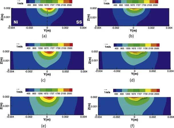 圖3(a–f)顯示了兩種情況下在加熱期間不同時(shí)間計(jì)算的溫度場(chǎng)和速度場(chǎng)的比較。圖中的輪廓值表示以Kelvin為單位的溫度。黃色和紅色部分代表液體區(qū)域。可以看出,在這兩種情況下,遠(yuǎn)離熔池的溫度場(chǎng)在不同時(shí)間是相似的,這表明了在傳統(tǒng)焊接力學(xué)中忽略流體流動(dòng)和質(zhì)量傳輸?shù)囊恍┖侠硇?。然而,?duì)于靠近熱源的區(qū)域,情況卻截然不同。對(duì)于情況1,熔合區(qū)更深、更窄,并且具有半球形,這是由于能量?jī)H通過(guò)熱傳導(dǎo)從激光束中心徑向傳輸而產(chǎn)生的。峰值溫度總是在304不銹鋼一側(cè),因?yàn)槠鋵?dǎo)熱系數(shù)遠(yuǎn)低于鎳。對(duì)于情況2,當(dāng)考慮流體流動(dòng)和質(zhì)量傳輸時(shí),由于最大熱輸入通量,峰值溫度向激光束中心移動(dòng)。當(dāng)表面張力的溫度系數(shù)為負(fù)值時(shí),流體從激光束的中心(表面張力變?。┝飨蛉鄢氐耐鈬?,增強(qiáng)了從熱零件到冷零件的能量傳輸。因此,情況2的峰值溫度遠(yuǎn)低于情況1(2423 K vs 3058 K),并且在加熱期間,熔池中的溫度梯度較小。圖4(a–d)顯示了兩種情況在冷卻循環(huán)期間計(jì)算的溫度場(chǎng)和速度場(chǎng)的比較。在激光器關(guān)閉后,情況2的熔池僅保持液態(tài)30 ms,而情況1的時(shí)間要長(zhǎng)得多(約140 ms)。