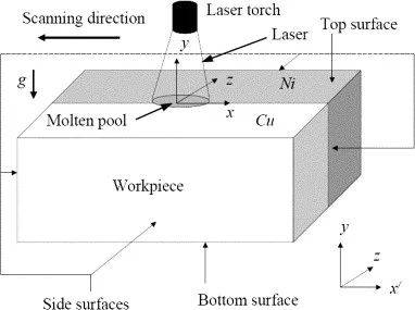 本文建立了一個(gè)瞬態(tài)三維模型來(lái)模擬不銹鋼-鎳異種熱電偶激光點(diǎn)焊過(guò)程中的傳熱傳質(zhì)過(guò)程。為了簡(jiǎn)化計(jì)算,做出以下假設(shè):