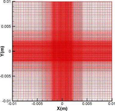 整個(gè)矩形計(jì)算域被劃分為小的矩形控制體。控制方程在交錯(cuò)網(wǎng)格上用控制體積法離散。壓力、溫度、物種濃度等標(biāo)量存儲(chǔ)在計(jì)算單元的中心。速度分量存儲(chǔ)在相應(yīng)的單元面中心。數(shù)值解的一般框架基于SIMPLEC算法。使用159×160×50網(wǎng)格的非均勻網(wǎng)格,在熱源附近使用更細(xì)的網(wǎng)格。最小網(wǎng)格間距為20μm。上表面用于數(shù)值模擬的網(wǎng)格如圖2所示。
