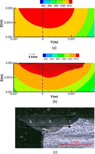 (1)給出了兩種情況下的模擬結(jié)果,以說(shuō)明異種熱電偶激光焊接過(guò)程中流體流動(dòng)對(duì)傳熱的重要性。遠(yuǎn)離熔池的溫度場(chǎng)不受流體流動(dòng)的影響。然而,對(duì)于靠近熱源的位置,當(dāng)考慮流體流動(dòng)時(shí),加熱期間的峰值溫度和溫度梯度都會(huì)降低。冷卻速度增加,熔池凝固更快。