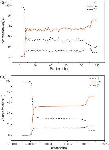 圖10顯示了計(jì)算和實(shí)驗(yàn)元素分布的比較。掃描軌跡如圖9(c)所示。計(jì)算結(jié)果與實(shí)驗(yàn)結(jié)果吻合良好,表明了本文數(shù)值模型的有效性。通過(guò)Marangoni對(duì)流和質(zhì)量擴(kuò)散,元素在熔池中幾乎均勻分布,根據(jù)Fe–Ni二元相圖,凝固過(guò)程中的溶質(zhì)分配不明顯。