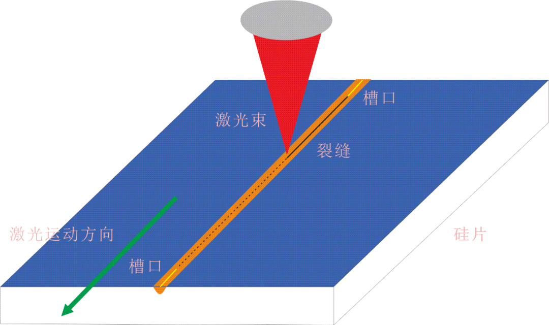 激光無損裂片即是通過激光精確控制加熱與局部輔助冷卻使硅片產(chǎn)生較大溫度梯度,材料產(chǎn)生熱應(yīng)力到斷裂閾值并產(chǎn)生斷裂,裂縫沿著由激光束路徑引起的熱梯度傳播導(dǎo)致材料完全分開。其核心原理是激光熱應(yīng)力控制斷裂技術(shù)。為了精確控制裂紋走向, 需在電池片首末端分別加工一個超小的槽口,使斷裂擴(kuò)展從槽口開始至槽口結(jié)束。