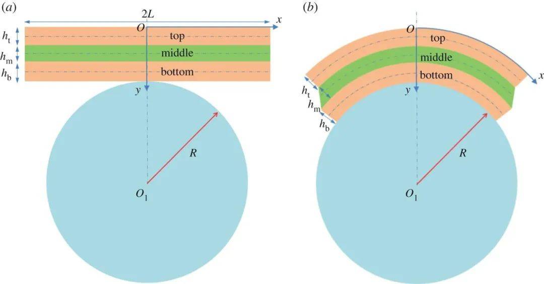 三層夾層結(jié)構(gòu)的理論模型。(a)自然、無壓力的狀態(tài)。(b)圓柱體上的變形狀態(tài)。