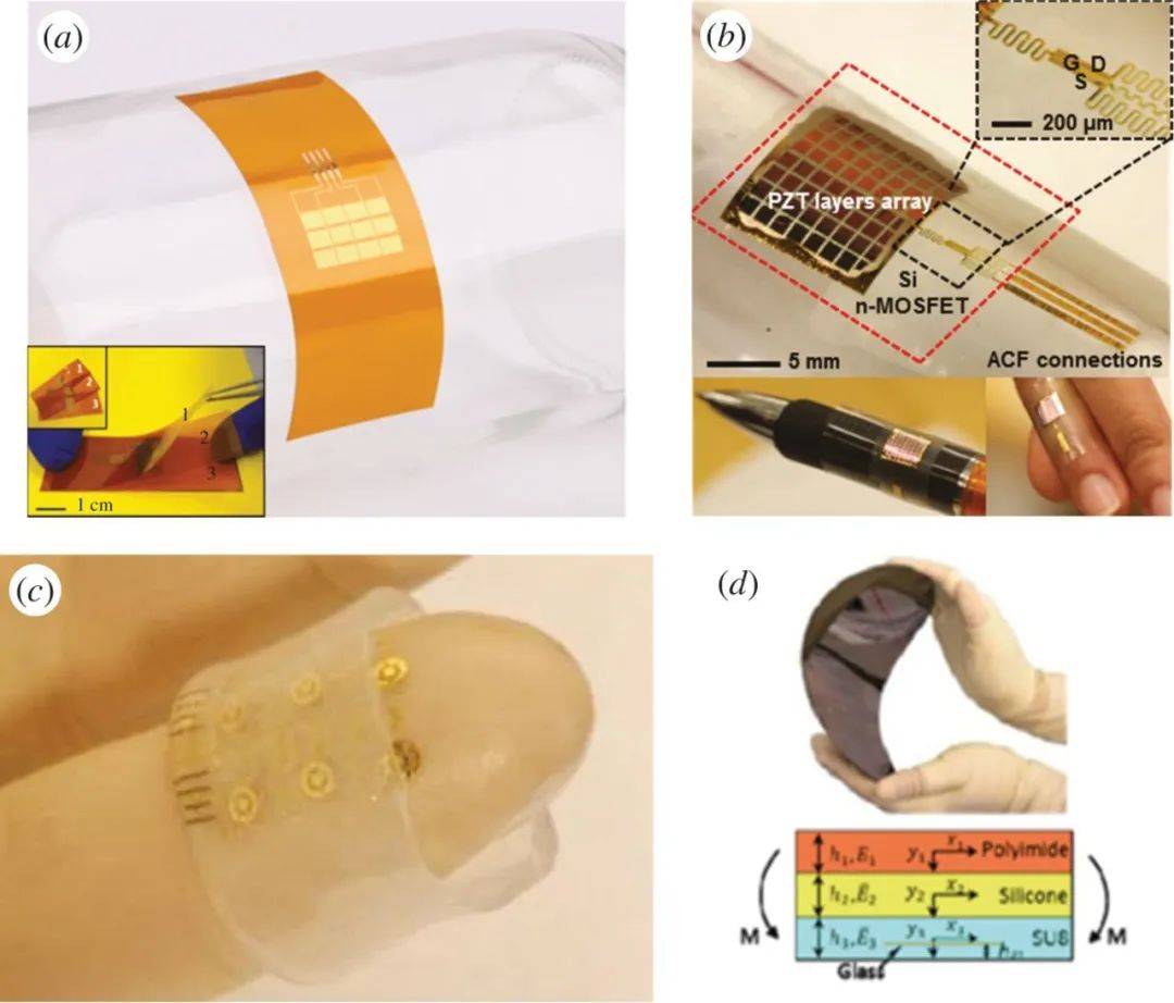 (a)三種硬PZT基壓電材料的堆疊和彎曲試驗(yàn)。(b)多層結(jié)構(gòu)的適形壓電壓力傳感器。(c)具有多層結(jié)構(gòu)的指尖電子設(shè)備。(d)具有多層結(jié)構(gòu)的柔性玻璃光子器件。