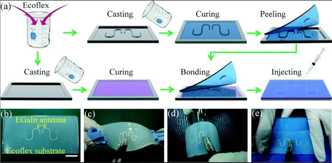 可拉伸微流控天線的示意圖和光學(xué)顯微圖:a)微流控天線的制造工藝;b)蛇形微流控天線的設(shè)計(jì)參數(shù);c–e)半波偶極子天線被扭曲、彎曲和拉伸。