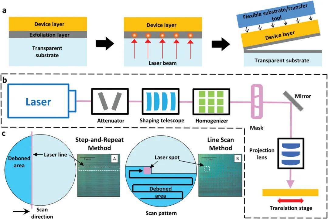 圖3a提供了LLO過程的代表性示意圖。將要分層的結(jié)構(gòu)/器件制造在透明襯底(例如石英和藍(lán)寶石)的頂面上,通常沉積有剝離層。激光通過透明基板照射,以顯著降低剝離層和基板之間的粘附力。短波長的脈沖激光器具有更高的吸收和更短的相互作用時(shí)間,以減少熱效應(yīng),保護(hù)上部結(jié)構(gòu)。因此,紫外波長和納秒脈沖寬度的準(zhǔn)分子激光器是常見的選擇。在完全掃描基板后,可以將結(jié)構(gòu)從其原始基板上分離,然后將其連接到柔性基板或轉(zhuǎn)移工具上。激光剝落的機(jī)理由激光類型、剝落層材料和工藝參數(shù)決定,非常復(fù)雜,包括激光誘導(dǎo)的化學(xué)反應(yīng)(如熱化學(xué)分解或燒蝕),或激光誘導(dǎo)的物理變化(如剝落層的淬火、熔化和汽化)。