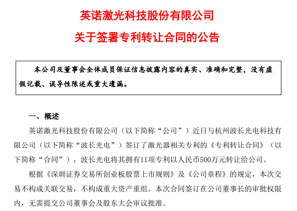 2022年4月28日晚間,英諾激光發(fā)布公告,公告顯示,英諾激光與杭州波長光電科技有限公司簽訂了激光器相關專利的《專利轉讓合同》,波長光電將其擁有11項專利以500萬元轉讓給英諾激光,其中包括9項發(fā)明專利,2項實用新型專利。
