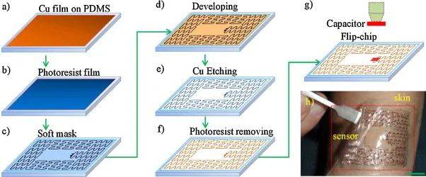 分形無線線圈(一種電LC諧振電路)的濕法蝕刻制造工藝如上圖所示。關(guān)鍵步驟如下。(a)一個(gè)銅膜~10μm的厚度被粘合到~200μm厚的PDMS基板。(b)銅表面旋涂厚度小于2μm的光刻膠。(c)使用具有自相似無線線圈圖案的軟掩膜來控制紫外線(UV)的穿透。將光刻膠系統(tǒng)上的掩模在紫外線下移入曝光機(jī),曝光約5–10分鐘。(d)將帶有光刻膠的可拉伸基板放入顯影粉末溶液(20 g/2 l),無紫外線照射的光刻膠將消失。圖案被轉(zhuǎn)移到光刻膠膜上。(e)將顯影后的銅膜放入刻蝕劑溶液(50g/200ml)中約15min,用刻蝕劑溶液刻蝕無光刻膠膜保護(hù)的銅,形成具有自相似結(jié)構(gòu)的分形線圈結(jié)構(gòu)膜。(f)光致抗蝕劑膜模具將通過丙酮溶液從銅線圈中釋放,并清潔分形銅線圈。(g)所選容量的Cs采用倒裝芯片工藝安裝在無線線圈上。各向異性導(dǎo)電膜用于將電容和無線線圈連接在一起??衫鞜o線線圈可以通過施加到PDMS基板端部的外力來拉伸。制造的自相似無線線圈安裝在皮膚上,如圖h所示。它可以通過與矢量網(wǎng)絡(luò)分析儀相連的外部無線線圈來監(jiān)測皮膚的應(yīng)變。