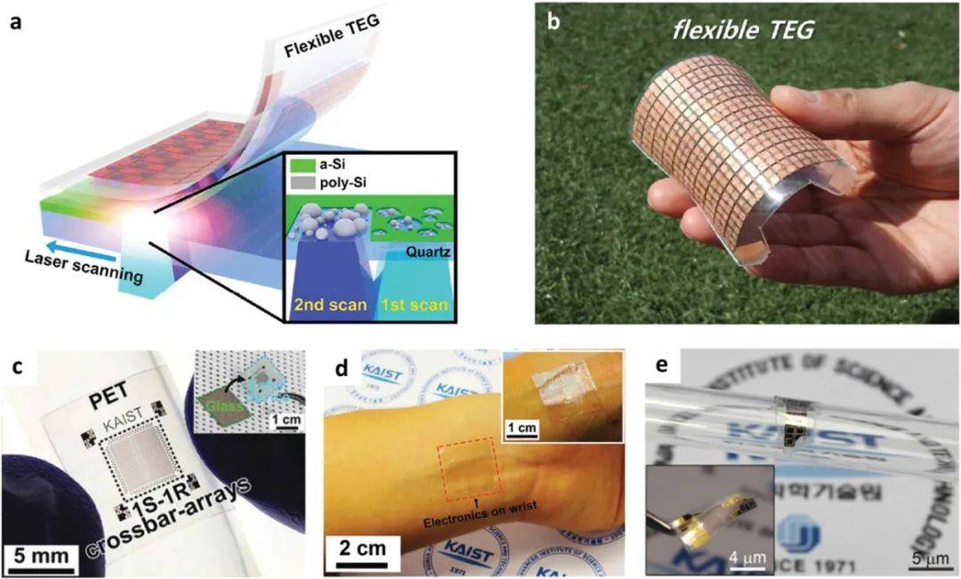 剩余襯底上隨機(jī)生成的硅納米結(jié)構(gòu)被認(rèn)為通過減小接觸面積來削弱緩沖氧化層和透明襯底之間的粘附。因此,較差的附著力使得整個(gè)裝置能夠從透明基板上分離,而不會(huì)造成任何損壞。然而,非常高的工藝溫度(超過500°C)將導(dǎo)致a-Si:H層脫水。缺乏氫來加速分離將導(dǎo)致分層過程中的失效。為了克服這一局限性,提出了一種稱為激光多掃描(LMS)去角質(zhì)工藝的先進(jìn)技術(shù)。使用準(zhǔn)分子激光多次暴露于脫水非晶硅(a-Si)層也可以降低剝離層和透明襯底之間的粘附力。在第一次曝光時(shí),僅隨機(jī)生成了少量的硅納米顆粒和微尺度孔洞。額外的激光掃描將非晶硅層完全轉(zhuǎn)變?yōu)樵S多硅納米顆粒(圖9e,f)。這種方法允許使用更高的工藝溫度(超過700°C)進(jìn)行器件制造。采用絲網(wǎng)打印技術(shù)(SPT)和LMS工藝制造了高性能柔性熱電動(dòng)力源(f-TEG)(圖10a,b)。700℃以上的退火工藝證明,該工藝可與SPT-700℃以上的應(yīng)用相兼容。這兩個(gè)過程的結(jié)合可以為大面積應(yīng)用提供更高的成本效益和更好的可擴(kuò)展性。