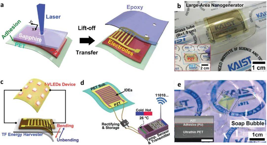 圖8 a) LLO制造高效柔性PZT基NG的工藝示意圖。b)在半徑為1.5cm的彎曲玻璃管上制作了大面積PZT基NG(3.5cm×3.5cm)。c)由LLO基NGs產(chǎn)生的電力運(yùn)行的自供電柔性發(fā)光系統(tǒng)示意圖。d)由基于LLO的NGs產(chǎn)生的電力運(yùn)行的自供電無線傳感器節(jié)點(diǎn)示意圖。e)漂浮在肥皂泡上的超薄柔性基板上的PZT薄膜照片(插圖比例尺=5μm)。