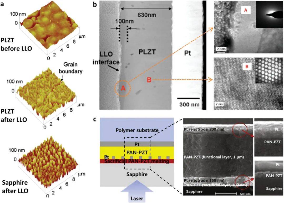 圖7 a) LLO前后PLZT和藍(lán)寶石表面的AFM顯微照片。LLO后,兩個(gè)表面都顯示出粗糙和扭曲的特征。b) PLZT薄膜經(jīng)LLO處理后的橫截面TEM圖像;區(qū)域A和區(qū)域B的高倍圖像分別顯示了非晶和晶相。c)基于PAN-PZT犧牲層的柔性器件的示意圖和橫截面SEM圖像。