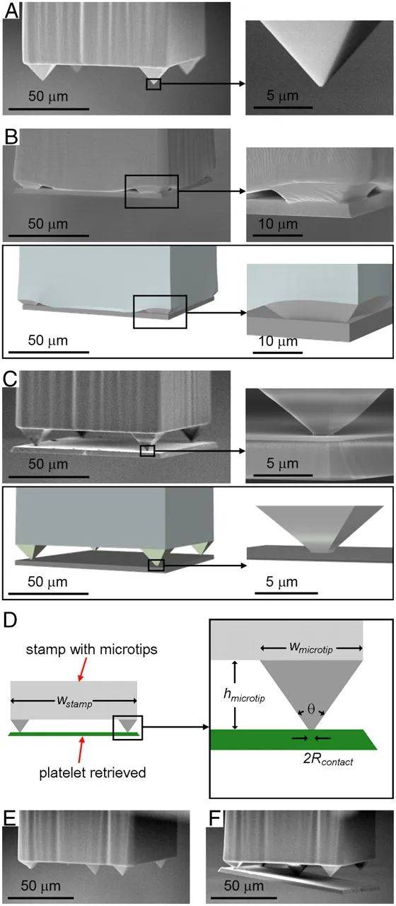 微尖端設計中具有代表性的彈性印章的SEM和FEM圖像,其表面有或沒有硅片(3μm厚;100×100μm)。(A–C)Four-tipped布局。右框提供了其中一個微針尖的放大視圖,下框提供了有限元建模結(jié)果的相應圖像(B,C)。(D)圖章尺寸標注示意圖。(E,F(xiàn))Five-tipped布局。在這種設計中,硅板在轉(zhuǎn)印過程的最后階段僅與最大的中央微尖端保持接觸。
